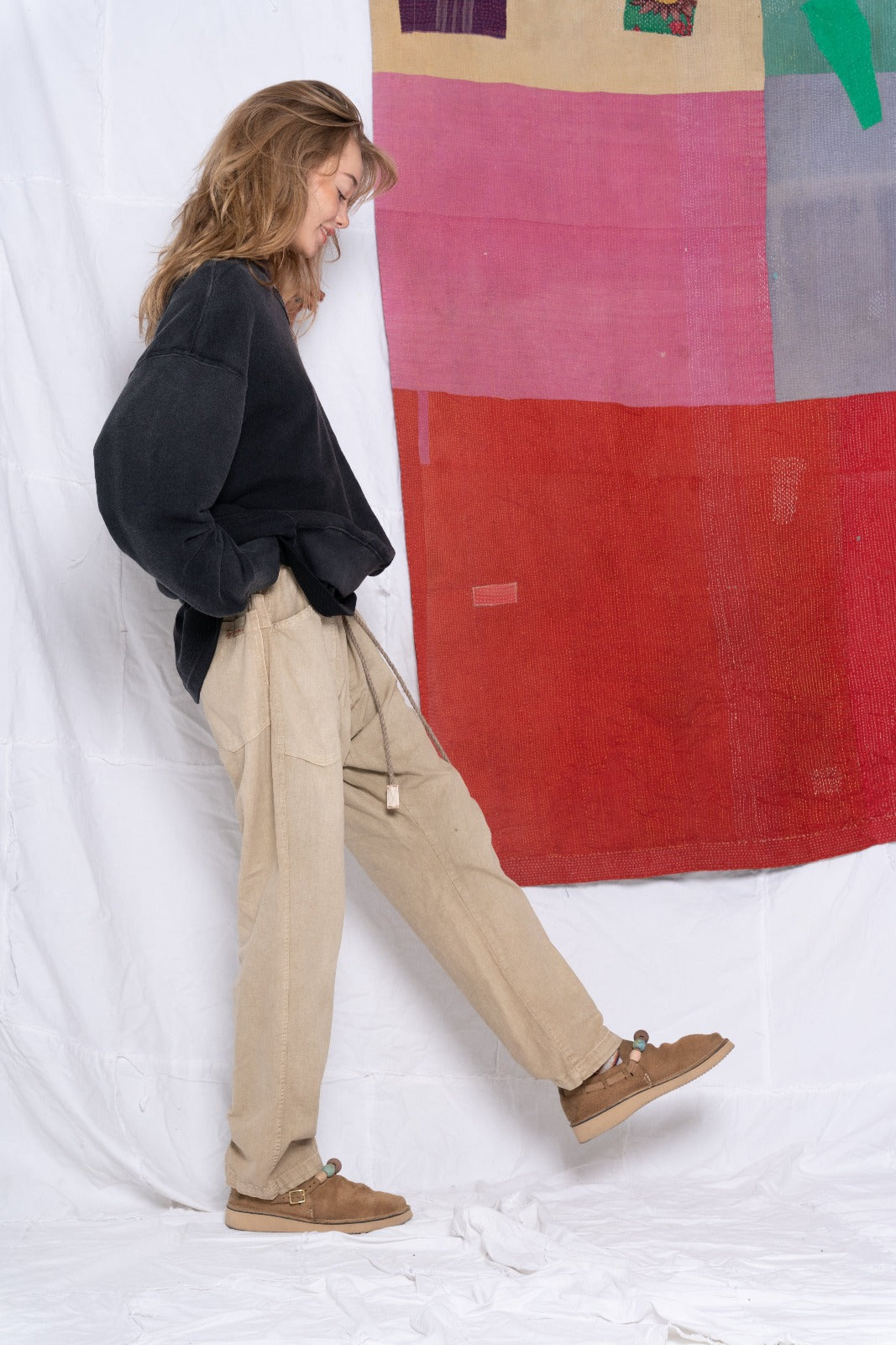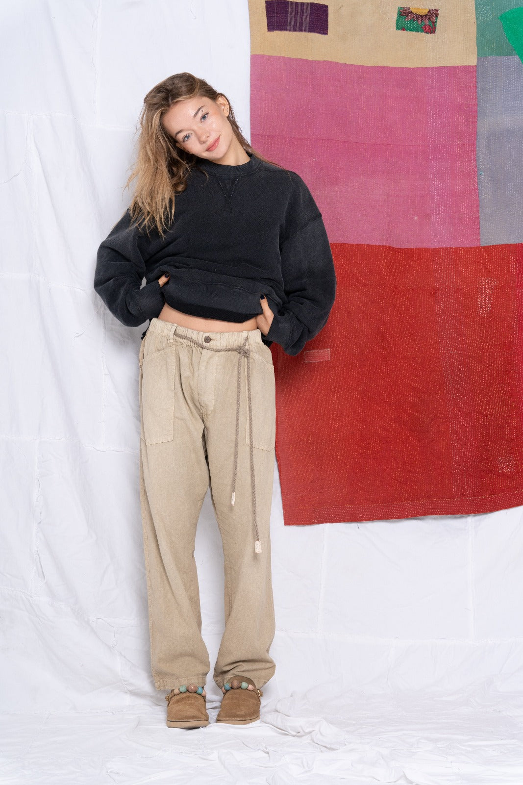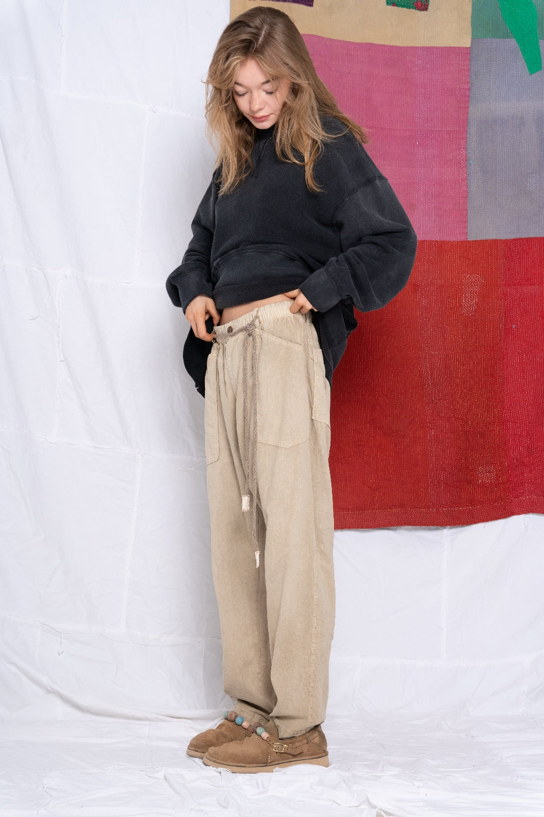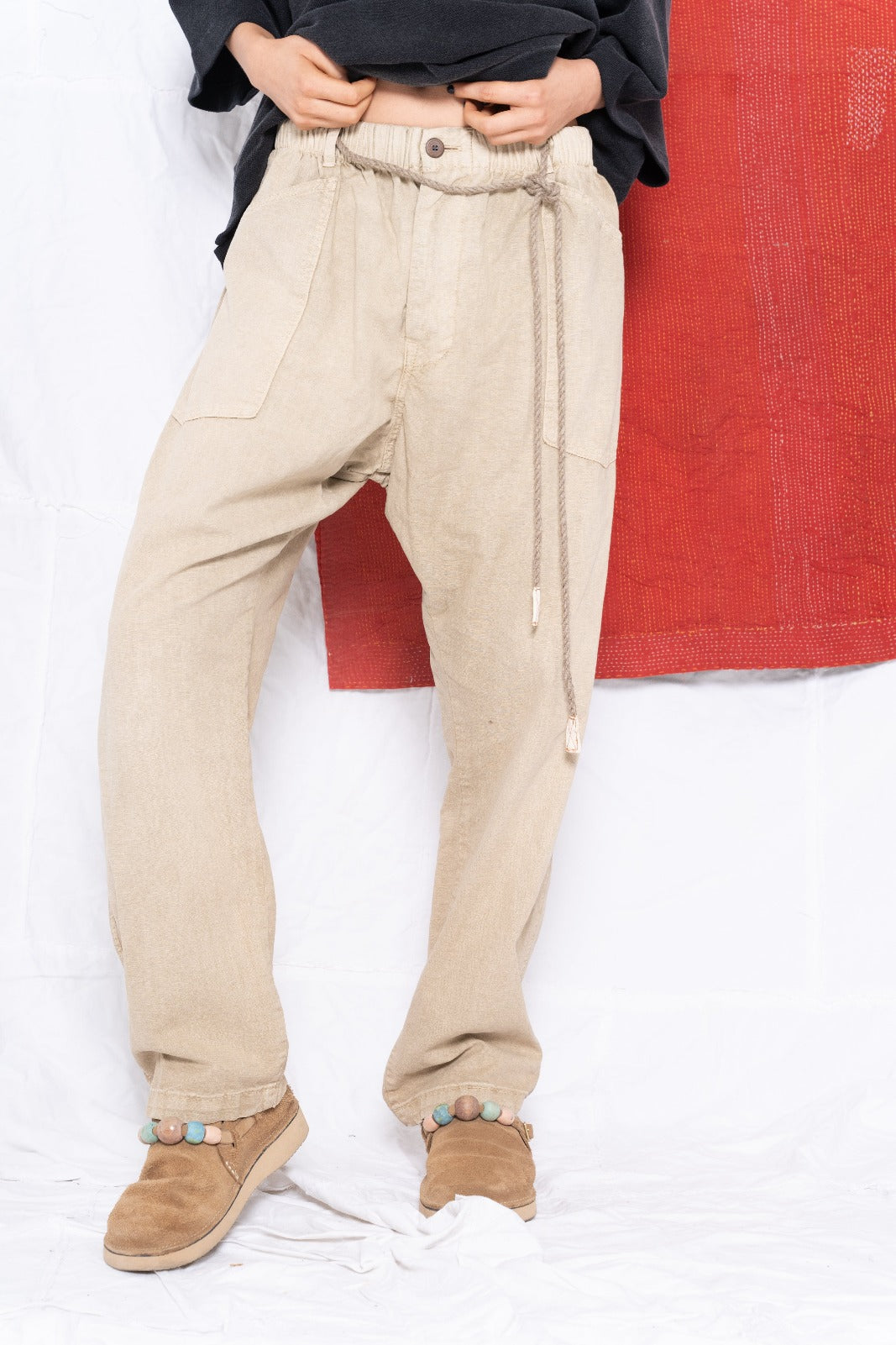 Our P38 Model, Comfort Fit, Straight Leg, Elasticated Waistband with a Self-Tie Natural Hemp Twill Belt with Stitched Twill Tab Ends. Made in a Soft Hemp & Organic Cotton Canvas-Like Fabric.