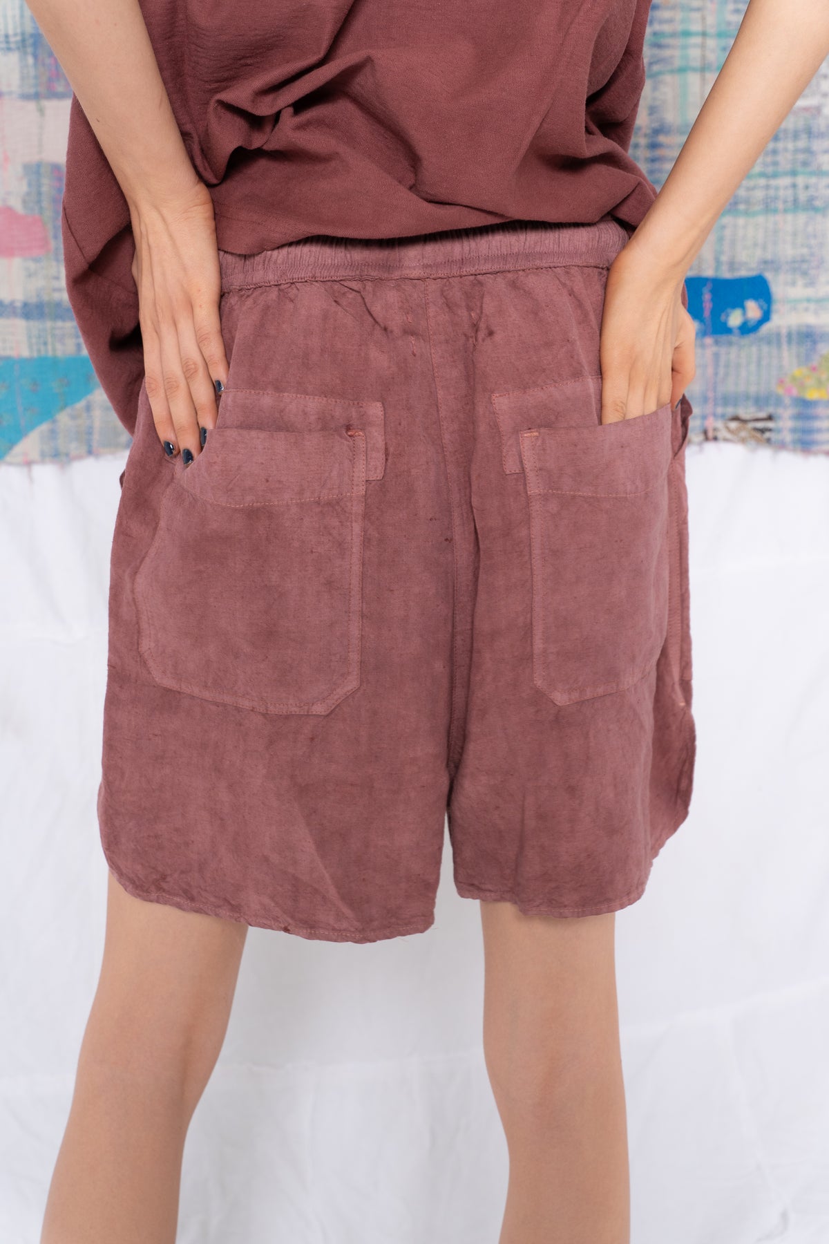 Our P62 Weekend Short, Pull On Style, Relaxed Comfort Fit, Shorter Inseam, Elasticated Waistband, Self-Tie Natural Hemp Twill Belt with Stitched Twill Tab Ends. Made in a Super Soft Light Weight Proprietary Wild Silk & Hemp Fabric with a Textured Surface.