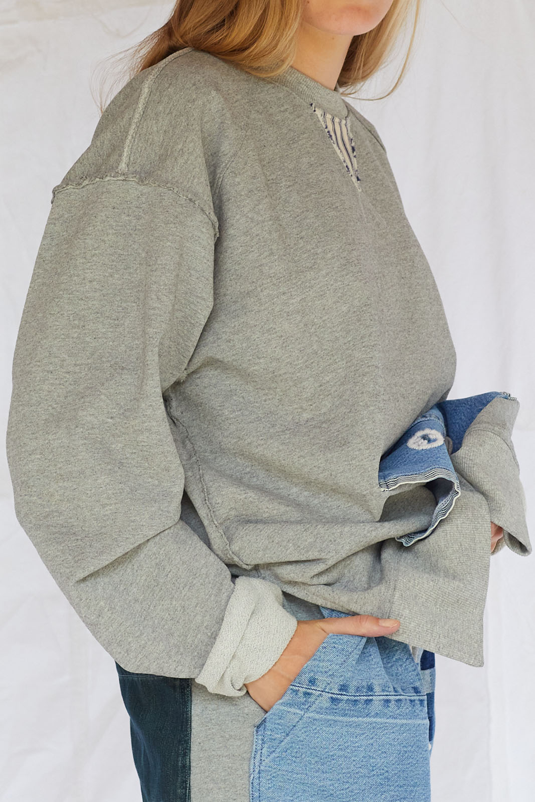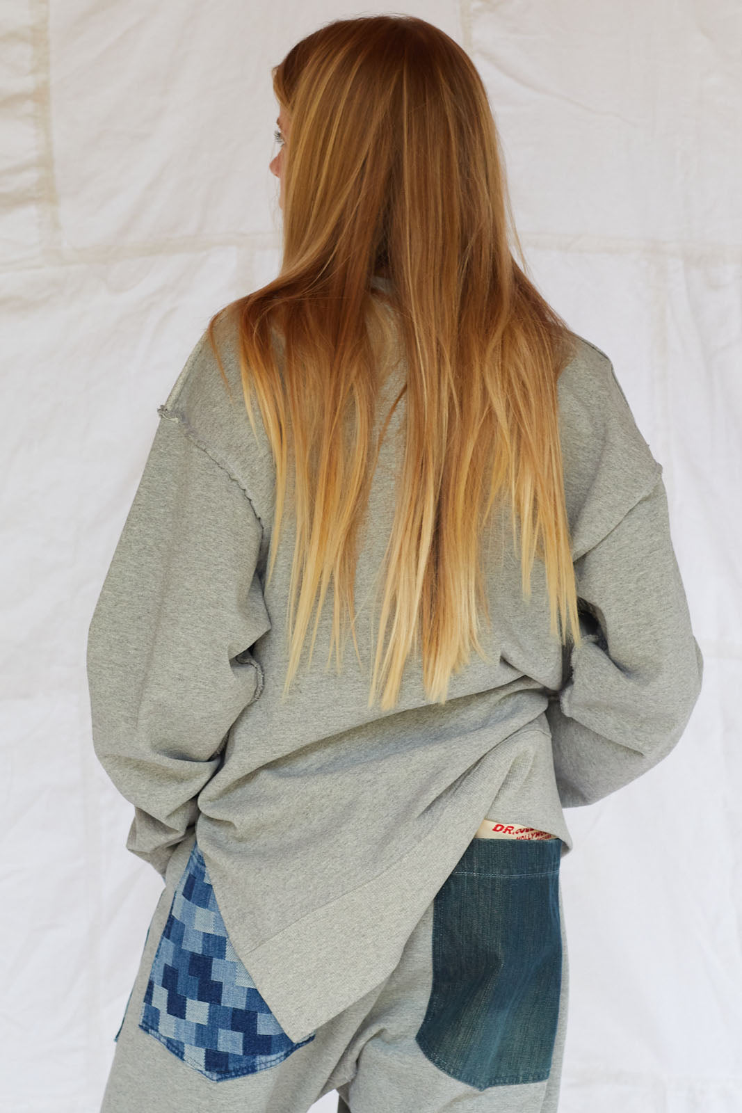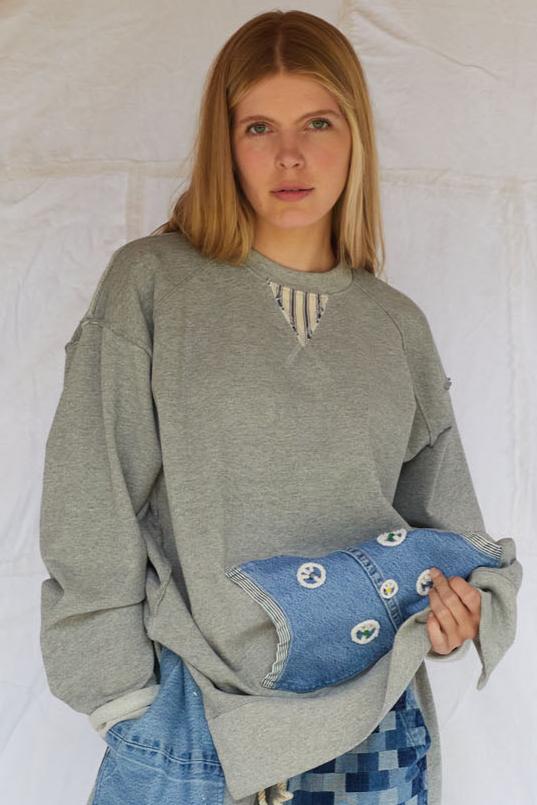 Pocket Made With Recycled 501 Denim Cayucos Sweat, Pin stripe de-stitch, side lower slit, relaxed lower ribbed. Stone Washed 100% Cotton Size: XS-XXL