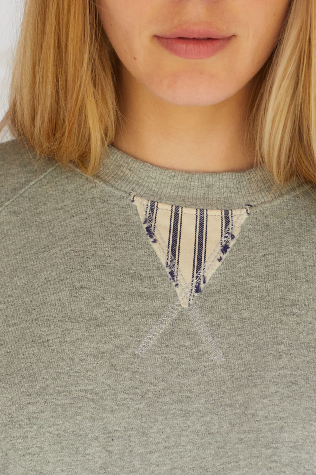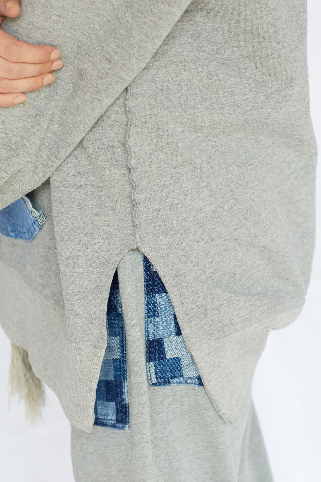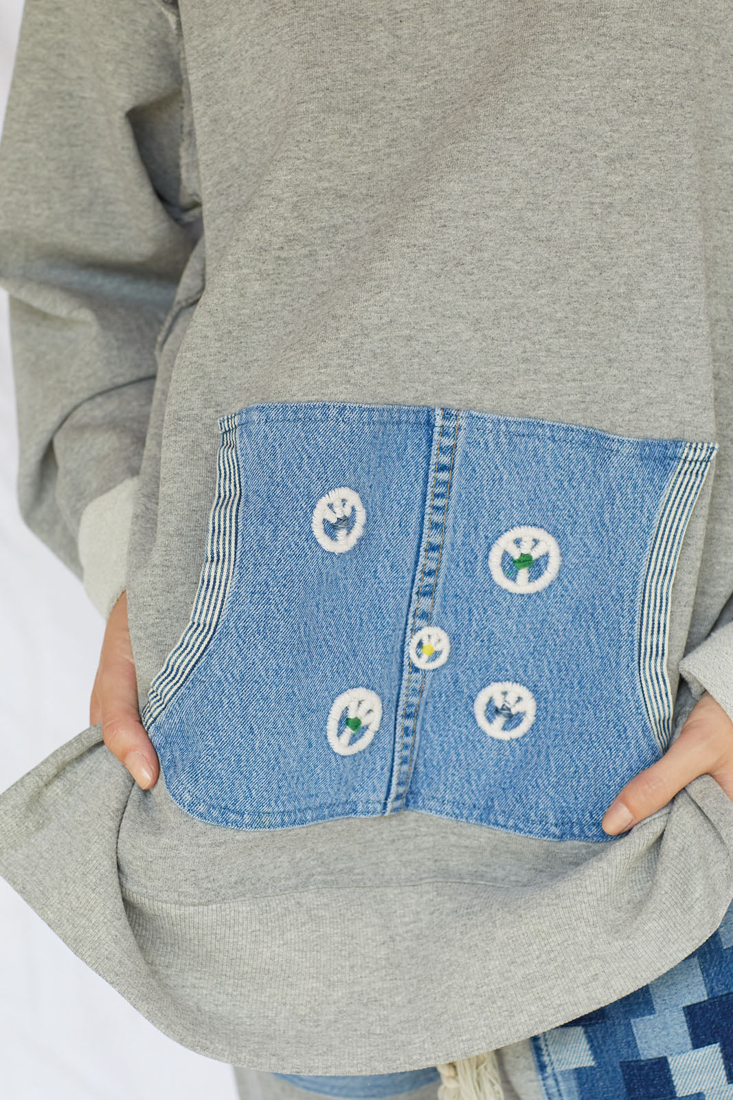 Pocket Made With Recycled 501 Denim Cayucos Sweat, Pin stripe de-stitch, side lower slit, relaxed lower ribbed. Stone Washed 100% Cotton Size: XS-XXL
